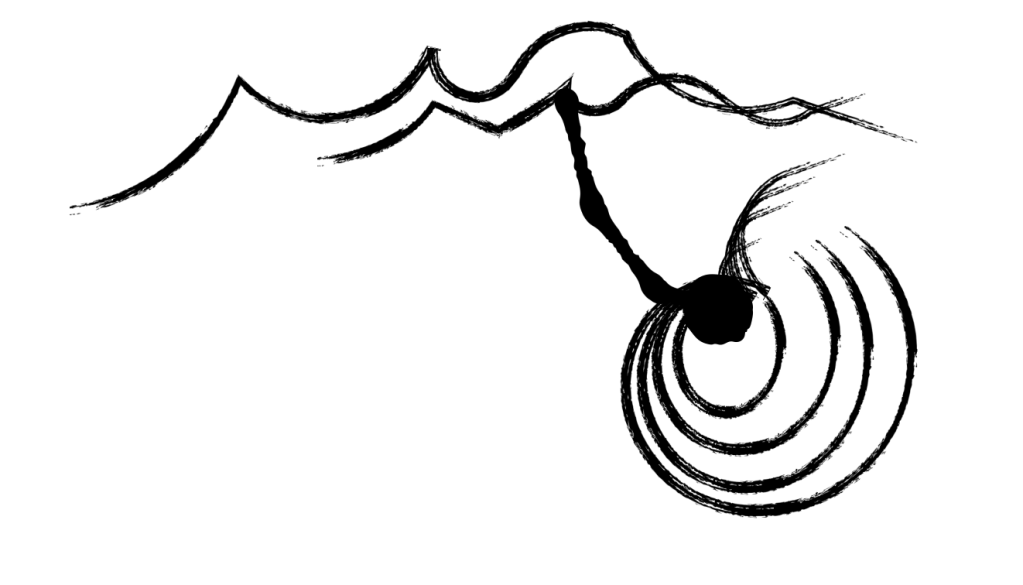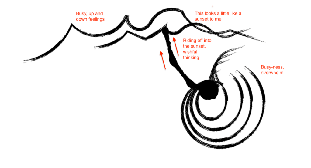 Recently, I have been facing change: aging parents, shifting family roles, political and cultural climate—a lot of moving parts—swirls and ups and downs. That thick dark line from the eye thing to the mountain/waves seems/feels like what I have been doing: “push through” it all, thinking that if I work hard enough, I can “ride into the sunset” where everything will be OK.